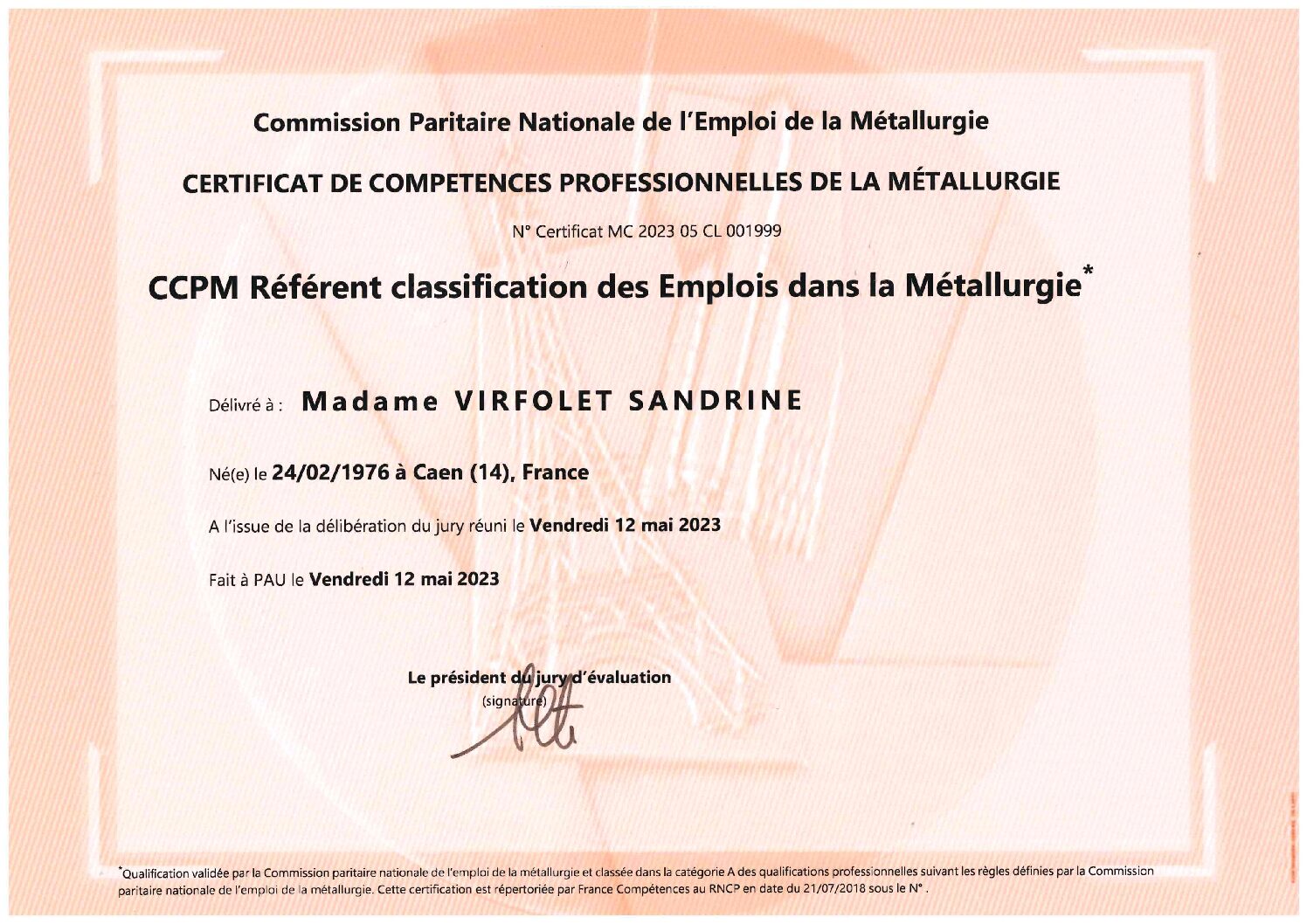 La Commission Paritaire Nationale de l’Emploi de la Métallurgie a remis à Sandrine VIRFOLET, notre Assistante Administrative et Comptable, son certificat de CCPM Référent classification des Emplois dans la Métallurgie.